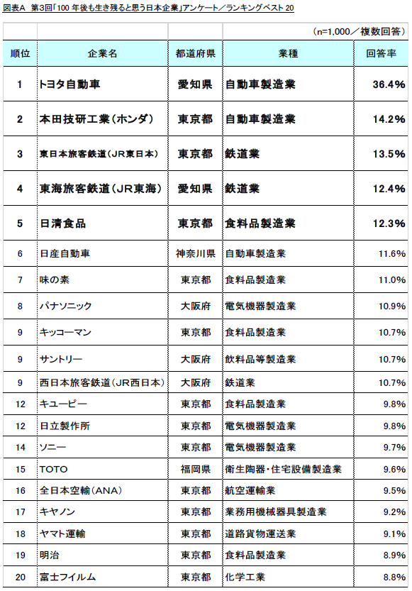 調査結果発表:リスモン調べ~第3回「100年後も生き残ると思う日本企業」調査~上位4社は自動車2社と鉄道2社で昨年と同じ企業に!