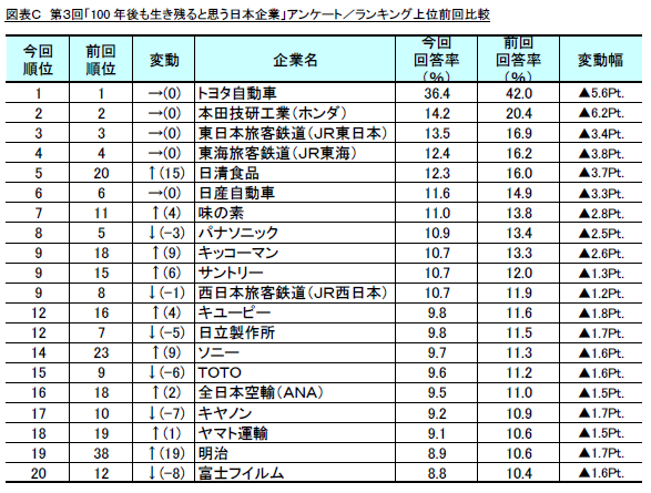2015年7月発表の第2回「100年後も生き残ると思う日本企業」アンケートの結果と比較したところ、上位4社「トヨタ自動車」と「本田技研工業(ホンダ)」、「東日本旅客鉄道(JR東日本)」、「東海旅客鉄道(JR東海)」に変化はなく、「日清食品」(前回20位→今回5位)、「味の素」(前回11位→今回7位)、「キッコーマン」(前回18位→今回9位)など9社が順位を上げた一方で、「パナソニック」(前回5位→今回8位)、「西日本旅客鉄道(JR西日本)」(前回8位→今回9位)、「日立製作所」(前回7位→今回12位)の6社はそれぞれ順位を下げた結果となりました。