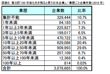 本アンケートで上位20社にランクインした企業は、日本を代表する企業であり、そのいずれもが今後100年を超えて生存し続けるだけの要素を兼ね備えていることは明らかです。しかし、実際に現時点で100年を超えているのはわずかに5社(サントリー、味の素、日立製作所、TOTO、明治)だけでした。ちなみに、当社が保有する企業情報データベースにおいても、100年以上の業歴を有する企業は、わずか814社(0.03%)であり、企業を100年以上に渡って存続させていくことが、いかに難しいことかを物語っています。(図表E)