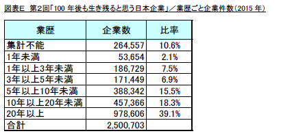 しかし、その中においても100年以上の業歴を有する企業は、わずか3.3万社(1.3%)であることを考えると、いかに100年以上に渡って企業を存続させていくことが難しいということが分かります。(図表E)