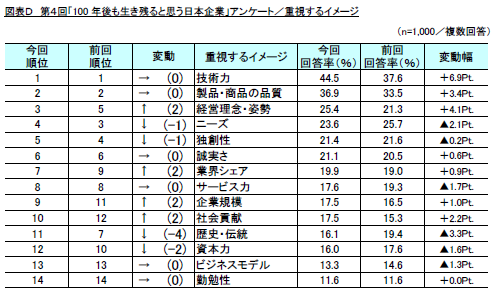 調査結果発表:リスモン調べ~第4回「100年後も生き残ると思う日本企業」調査~技術力や品質だけでなく経営理念・姿勢が評価される結果に
