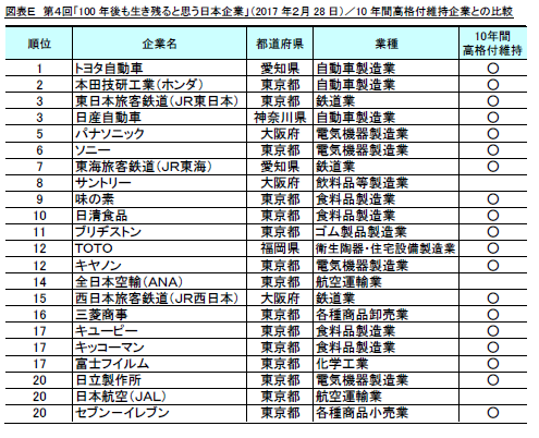 第4回「10年間高格付を維持している優良企業」調査(2017年2月28日発表)と比較したところ、今回のランキング上位22社のうち19社が10年間高格付を維持している優良企業に該当しています。(図表E)