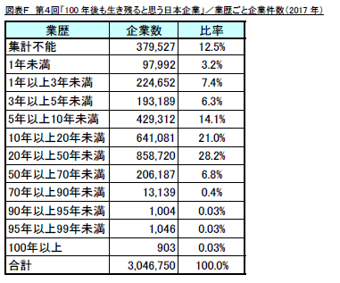 リスモンが有する企業情報データベースにおいて、業歴が20年以上の企業は全企業約304万社のうち、約108万社(35.5%)であり、また、この1年間に設立された企業は約9.8万社(3.2%)程度です。業歴の長い企業の割合が高く、業歴の浅い企業が少ないことは、日本経済が成熟期を迎えているからといえます。しかし、その中においても100年以上の業歴を有する企業は、わずか903社(0.03%)であることを考えますと、100年以上に亘って企業を存続させていくことがいかに難しいかということが分かります。(図表F)