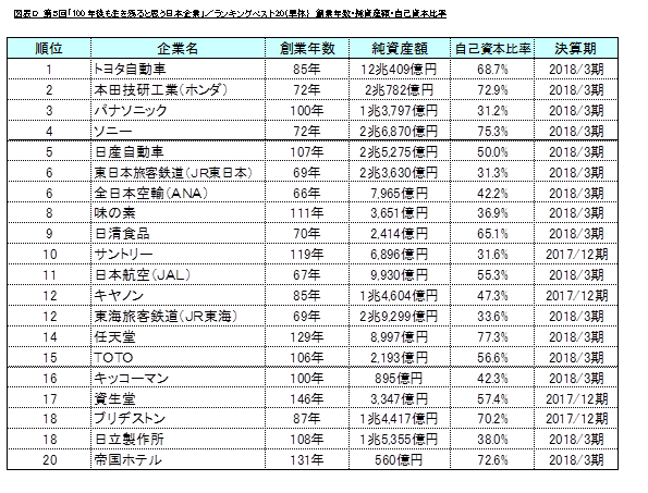 また上位20社においては相応の純資産額と自己資本を有していることも確認できます。長い業歴の中で安定した事業基盤、財政基盤を築き上げている企業が100年後も生き残る企業として考えられている結果となりました。(図表C、D)