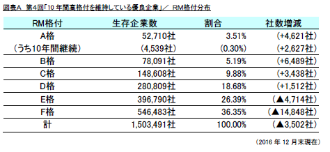 2016年12月末時点でリスモンがRM格付(A~F格)を付与している企業1,503,491社を対象に、2007年1月~2016年12月の10年間でA格を維持し続けている優良企業を集計したところ、4,539社であり、前回(1,912社)から2,627社も大幅に増加した結果となりました。(図表A)