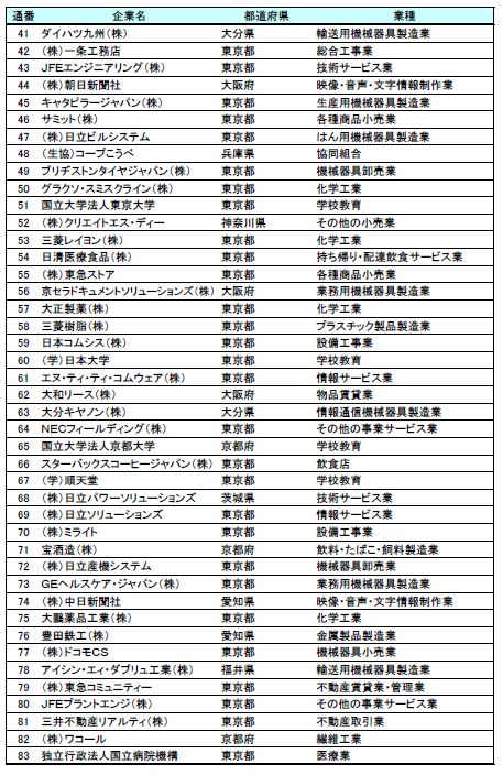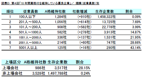 しかし、一方で、集計対象企業に対するA格維持企業の割合では、従業員数が多い企業ほど、その割合が高くなる傾向が顕著に表れていることから、定説どおり大規模企業の方が優良かつ安定した企業になりやすいことが表れているといえます。