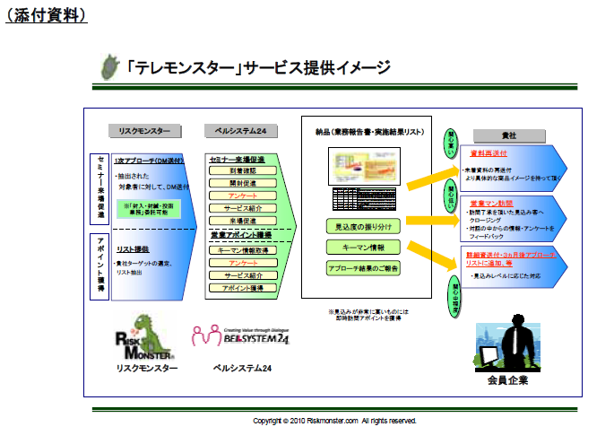 リスモンとベルシステム24との提携により、リスクモンスター会員へ安価な「会員特別価格」にて提供いたします。また有望な見込み客のみに営業を集中でき、営業コストの圧縮が可能です。さらに、営業電話による見込み客抽出をアウトソーシングすることにより、確度の高い見込み客のみに自社の営業戦力を集中できます。