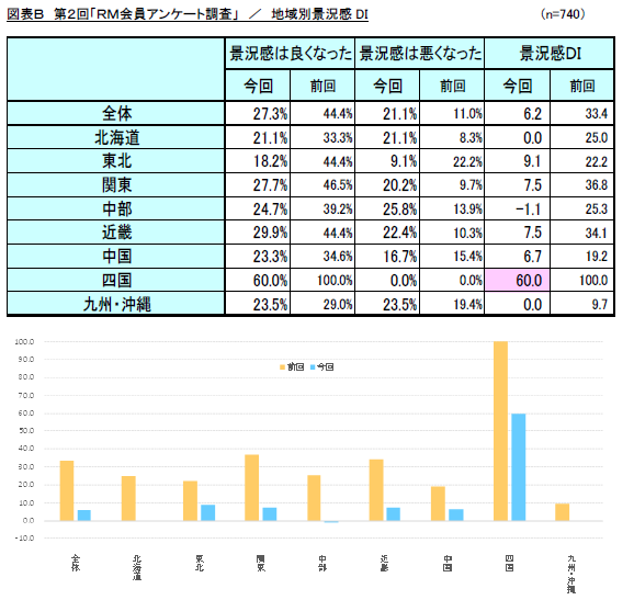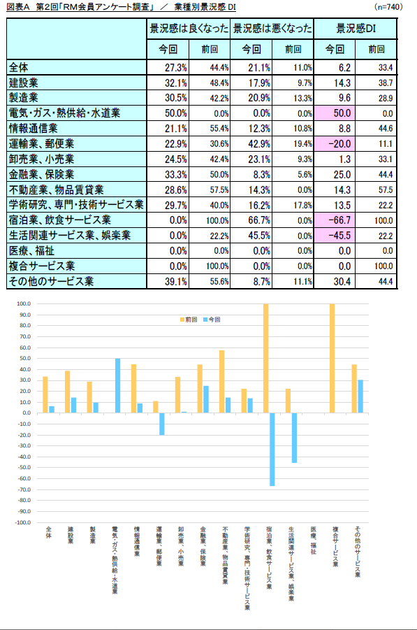 今回の調査において、RM会員企業における景況感DIはプラス6.2となり、日銀が10月1日に発表した全国企業短期経済観測調査(短観)では、業況判断指数(DI)が大企業製造業でプラス12、同非製造業でプラス25と比較して低い水準となりました。前回調査時(プラス33.4)よりも景気の高揚感が鈍化している様子がうかがえます。