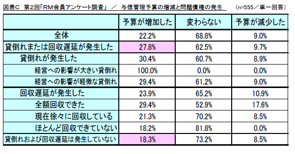 その一方で、直近1年間の問題債権の発生においては、発生割合が前回調査時よりも低下していたり、取引先の増加に伴って与信管理予算を増加させている企業が多く存在していたりという一見矛盾した結果も表れています。