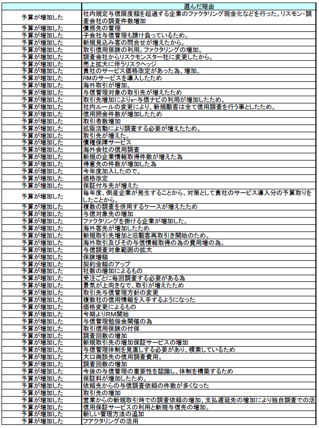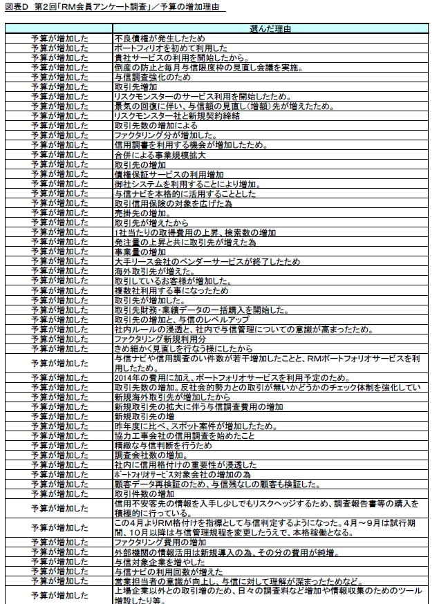 RM会員における昨年度と今年度の与信管理に対する予算の増減理由を調査したところ、「予算が増加した理由」としては、「取引先が増加したため」という回答が最も多く、その他には「ファクタリングなどを活用した保全の強化を図るため」、「与信管理を新たに取り組むこととなったため」「貸倒れが発生したため」という回答が見られました。(図表D)