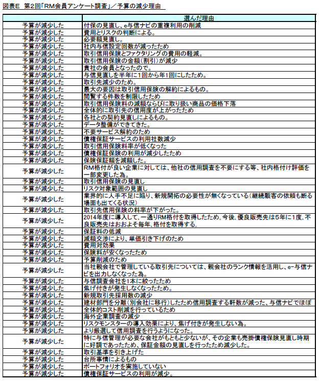 一方で、「予算が減少した理由」としては、「取引信用保険の見直し」という回答が最も多く、その他に「コスト削減のため」、「格付を使うことで効率を高めコストを低減した」という回答がみられました。(図表E)