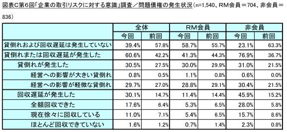 一方、RM会員においては、過半数が「貸倒れおよび回収遅延は発生していない」と回答(同58.7%)しており、非会員(同76.9%)の回答を大幅に下回りました。貸倒れ・回収遅延が増加する中で、RM会員においてはリスクを回避できている様子がうかがえる結果となりました。(図表C)