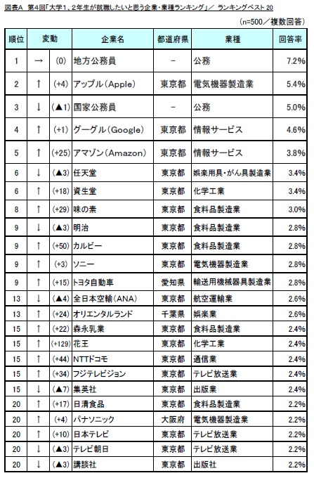 前回調査結果との比較では、1位「地方公務員」は過去4回の調査全てにおいて1位となった一方、前述のとおり「国家公務員」(前回2位→今回3位)は「アップル(Apple)」に順位を明け渡し、ランクダウンとなりました。食料品製造業の「味の素」(前回37位→今回8位)、「カルビー」(前回59位→今回9位)、「森永乳業」(前回37位→今回15位)、「日清食品」(前回37位→今回20位)や、テレビ放送業の「フジテレビジョン」(前回49位→今回15位)、「日本テレビ」(前回30位→今回20位)が大きく順位を上げました。その他では「アマゾン(Amazon)」(前回30位→今回5位)、「NTTドコモ」(前回59位→今回15位)、「花王」(前回144位→今回15位)が大幅に順位を上げる結果となりました。
