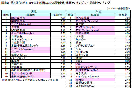 一方、女性が望む就職先のランキング1位は「地方公務員」(回答率7.3%)となり、次いで「グーグル(Google)」(同5.2%)が2位、「資生堂」(同4.9%)が3位でした。(図表B)