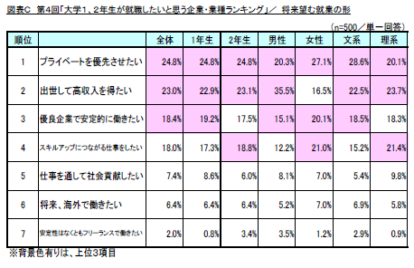 将来望む就業の形としては「プライベートを優先させたい」(回答率24.8%)が1位、次いで「出世して高収入を得たい」(同23.0%)、「優良企業で安定的に働きたい」(同18.4%)の順となりました。男性においては「出世して高収入を得たい」という意向が、女性においては「スキルアップにつながる仕事をしたい」という意向が強い傾向が見受けられました。(図表C)
