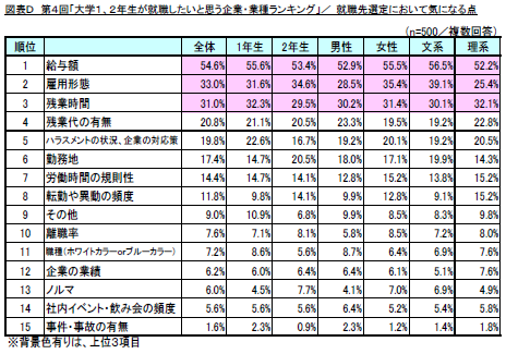 就職先の選定において気になる点では「給与額」(回答率54.6%)が1位、「雇用形態」(同33.0%)が2位、「残業時間」(同31.0%)が3位となり、全てのセグメントにおいて「給与額」の割合の高さが際立つ結果となりました。(図表D)