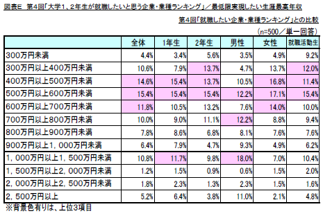 さらに「第4回就職したい企業・業種ランキング調査」における就職活動生と比較したところ、最低限実現したい生涯最高年収が平均年収未満(400万円未満)で良いと回答している割合が1年生(回答率11.3%)、2年生(同19.3%)、就職活動生(同21.2%)と学年が上がるにつれ高まっており、2年生や就職活動生は1年生に比べてより一層現実的な就職先をイメージしていることが考えられます。(図表E)
