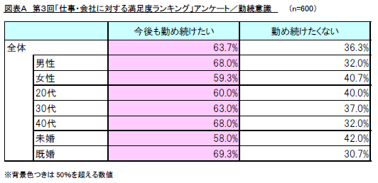 毎年2月に発表しております「仕事・会社に対する満足度」調査。「仕事・会社に対する勤続意欲」は、前回同様、「今後も勤め続けたい」(回答率63.7%)が「勤め続けたくない」(同36.3%)を大きく上回る結果となりました。(図表A)
