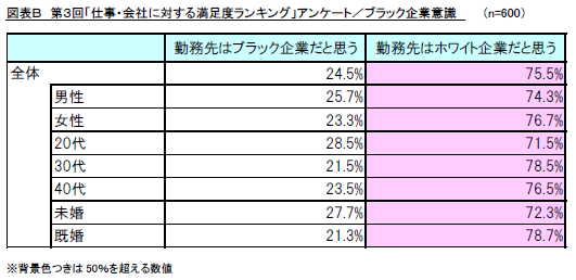 第3回となります今回は趣向を変え、自身の勤務先が「ブラック企業と思うか」との意識調査を加えたところ、「勤務先はブラック企業だと思う」は回答率24.5%となり、「勤務先はホワイト企業だと思う」の回答率75.5%を大きく下回ったものの、おおよそ4人に1人は自身が勤務する企業がブラック企業だと感じているという驚愕の結果となりました。さらには、男女別、年代別、未既婚別のいずれにおいても約4分の1がブラック企業と回答しています。(図表B)