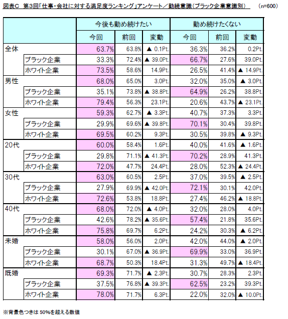 ブラック企業意識の有無と勤続意欲の関連性では、「勤務先がブラック企業だが、今後も勤めたい」が回答率33.3%と、3人に1人が自身の勤め先をブラック企業と認識しながらも勤め続ける意思を示しており、特に家庭を支えなければいけない40代や既婚者においては、その比率が4割程度にまで高まるなど、生活の安定や家族を守るために過酷な労働を享受するサラリーマンの悲哀を想像させる結果となりました。(図表C)