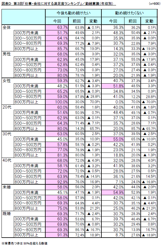 勤続意欲についての年収別での調査では、「今後も勤め続けたい」と回答した割合は、年収が高くになるにつれて高まる傾向の中、年収300万円未満では年収300万円以上に比べて10ポイント以上も回答割合が低い結果となりました。(図表D)