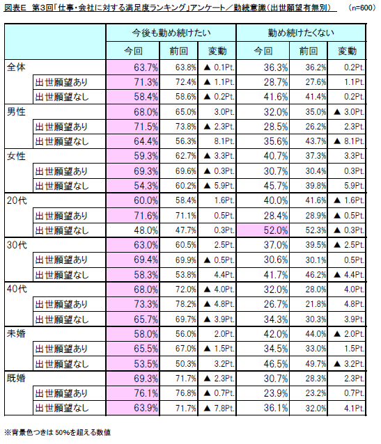 次いで、勤続意欲と出世願望の有無の関係性では、性別、年齢別、未既婚別のすべてのカテゴリにおいて、出世願望がある方が、勤続意欲が高い結果となったことから、出世欲は一つの会社に勤め続けていくための大きなモチベーションの一つとして捉えることができます。(図表E)