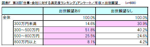 さらに、年収と出世願望の関係性では、「出世願望なし」においては、約30%が「年収300万円未満」であったのに対して、「出世願望あり」においては、「300万円以上の全ての層」において、「出世願望なし」よりも構成比率が高い結果となりました。(図表F)