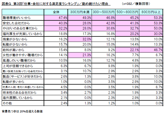 この上位3つについては、年収別においていずれの層でも高い回答率となっていますが、「300万円未満」においては、「残業が少ないから」(同32.0%)、「女性が働きやすい職場だから」(同21.3%)とライフスタイルに合っていることを理由に挙げているのに対して、「800万円以上」においては、「給料が高いから」(同46.7%)、「福利厚生が充実しているから」(同30.0%)と待遇の優位性を理由に挙げていることが特徴的です。(図表G)
