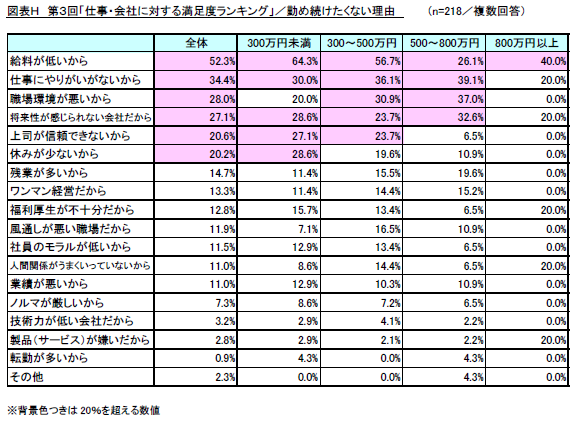 一方、「勤め続けたくない」理由では、1位「給料が低いから」(回答率52.3%)、2位「仕事にやりがいがないから」(同34.4%)、3位「職場環境が悪いから」(同28.0%)という結果となりました。