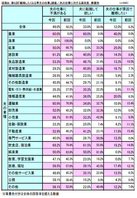 中でも「飲食店、宿泊業」と「医療、福祉」は前回調査に引き続き高い不満を持たれる業種として挙がっていることを考慮すると、妻から不満を持たれやすい業種になっているといえるでしょう。(図表B)