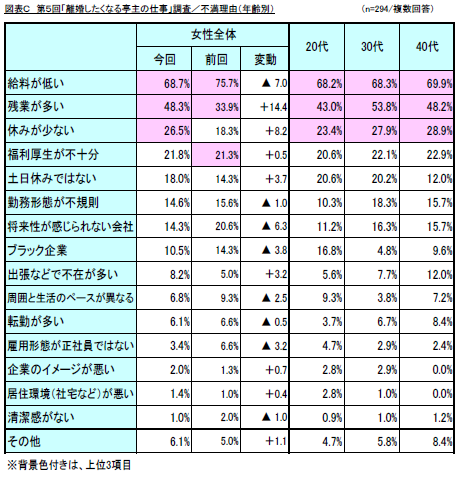 不満理由について、年代別に見ると「給料が低い」は全ての年代において70%近い回答率であるのに対して、「残業が多い」は中堅社員として働き盛りの30代において不満度が高いことが分かります。(図表C)