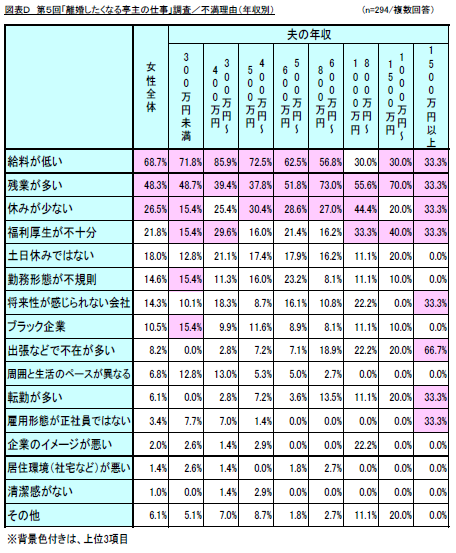 今回の調査結果において、夫の仕事に対して妻の約半数は不満をもっていることがわかり、そして妻の3人に1人が夫に転職して欲しいと思っており、10人に1人は夫の仕事が原因で離婚したいと思っていることが明らかになりました。これらの数値を少ないと感じるか多いと感じるかは、人によって分かれるところでしょう。