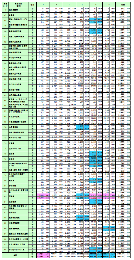 格付変動企業57,028社のうち、2ランク以上の変動企業は少なく、全体の87.3%は1ランク以内の変動に留まっています。格付変動状況としては、A格企業が1,231社増加し、D格企業が1,795社、E格企業が1,150社、F格企業が1,069社減少しました。