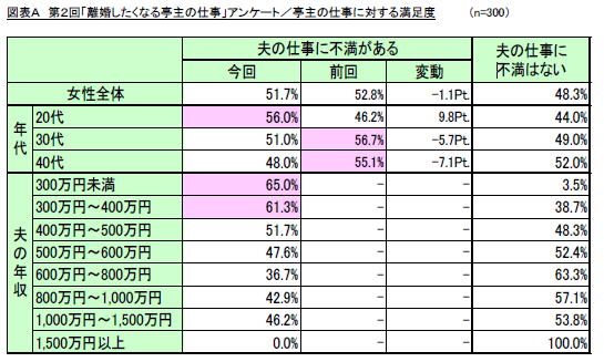 夫や妻の仕事が、婚姻関係にどの様な影響を与えているかを調査した本調査において、夫の仕事に対して、妻の約半数は不満を有しているという結果となりました。