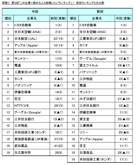 前回の第4回「この企業に勤める人と結婚したいランキング」の結果との比較では、上位2社に変動に変動はなく、3位「日本航空(JAL)」(前回22位)、4位「アップル(Apple)」(前回18位)が大幅にランクアップしています。その他トップ20では、13位「NTTドコモ」(前回28位)、18位「東海旅客鉄道(JR東海)」(前回37位)、19位「武田薬品工業」(前回41位)の大幅ランクアップが目立ちました。