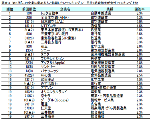 ・調査名称 : 第5回「この企業に勤める人と結婚したいランキング」調査