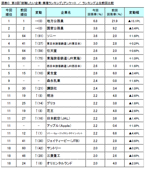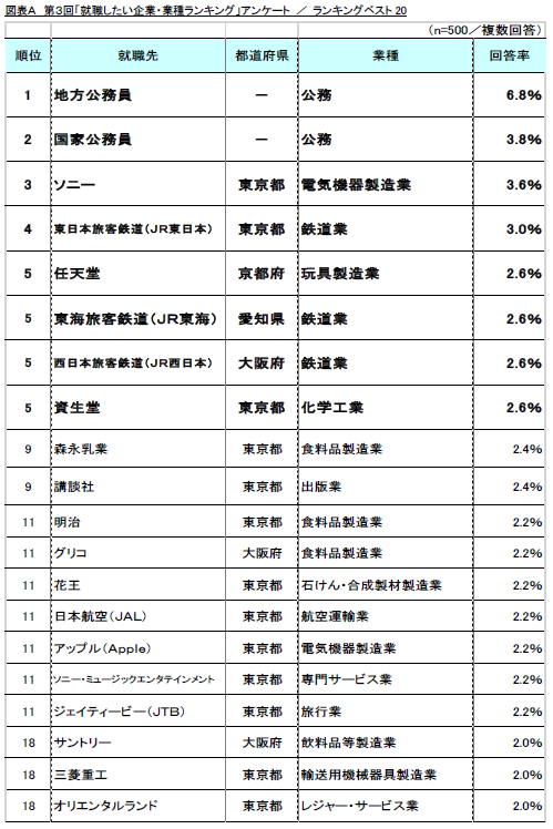 公務員についでソニー、JR3社、任天堂、資生堂が人気を集める