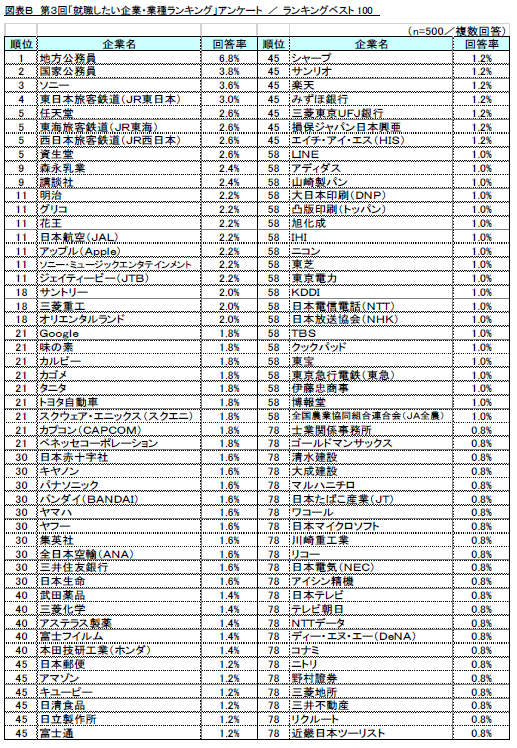 調査結果発表:リスモン調べ~第3回「就職したい企業・業種ランキング」調査~公務員についでソニー、JR3社、任天堂、資生堂が人気を集める