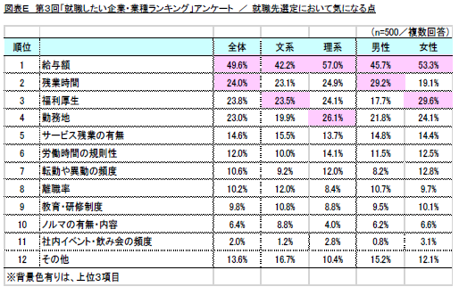 就職先の選定において気になる点では、「給与額」(回答率49.6%)が1位、「残業時間」(同24.0%)が2位、「福利厚生」(同23.8%)となり、「給与額」の高さが際立つ結果となりました。(図表E)
