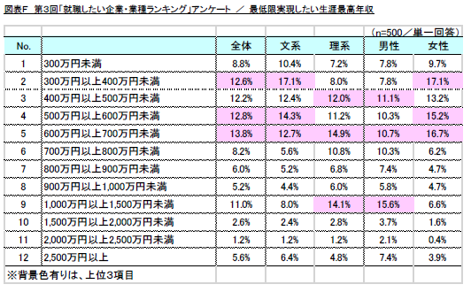 さらに、「給与額」について、最低限実現したい生涯最高年収を調査したところ、「600万円以上700万円未満」(13.8%)が最も多く、「500万円以上600万円未満」(12.8%)が2位、「300万円以上400万円未満」(12.6%)が3位となった。特に理系の男性においては、「1,000万円以上1,500万円未満」の高い年収を望む傾向が強くうかがえる結果となりました。(図表F)