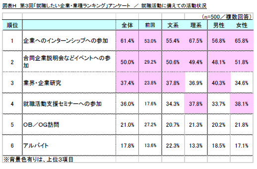 就職活動に備えた活動としては、「企業へのインターンシップへの参加」(回答率61.4%)が最も多く、「合同企業説明会などイベントへの参加」(同50.0%)、「業界・企業研究」(同37.4%)と続きました。前回と比較して、「合同企業説明会などイベントへの参加」や「就職活動支援セミナーへの参加」、「業界・企業研究」が大幅に増加していることから、就職活動生の姿勢がより積極的になっている傾向が見られます。(図表H)