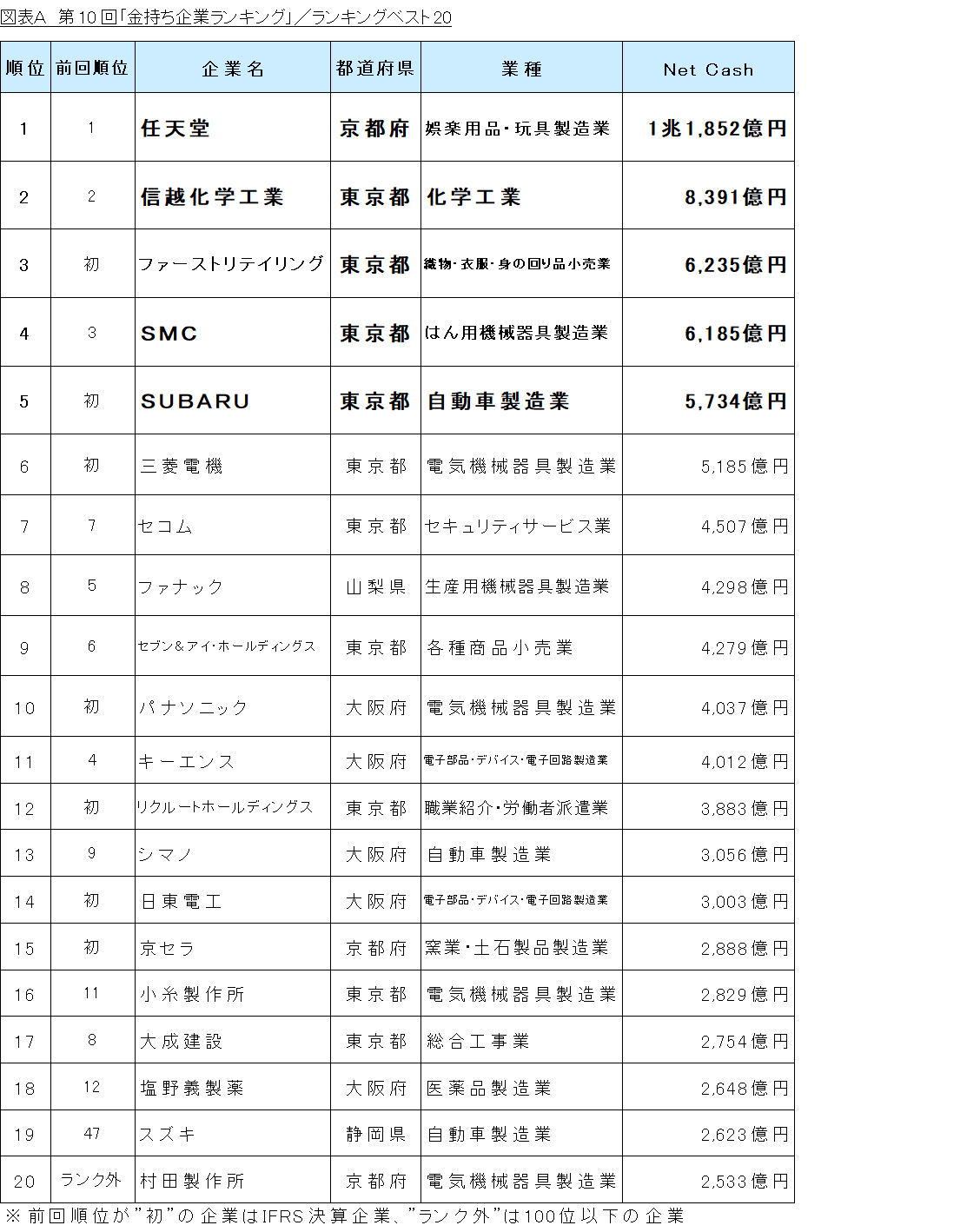 新たにランクインした企業が見られる中、第10回金持ち企業ランキングは、第8回に続いて「任天堂」が1位となりました。