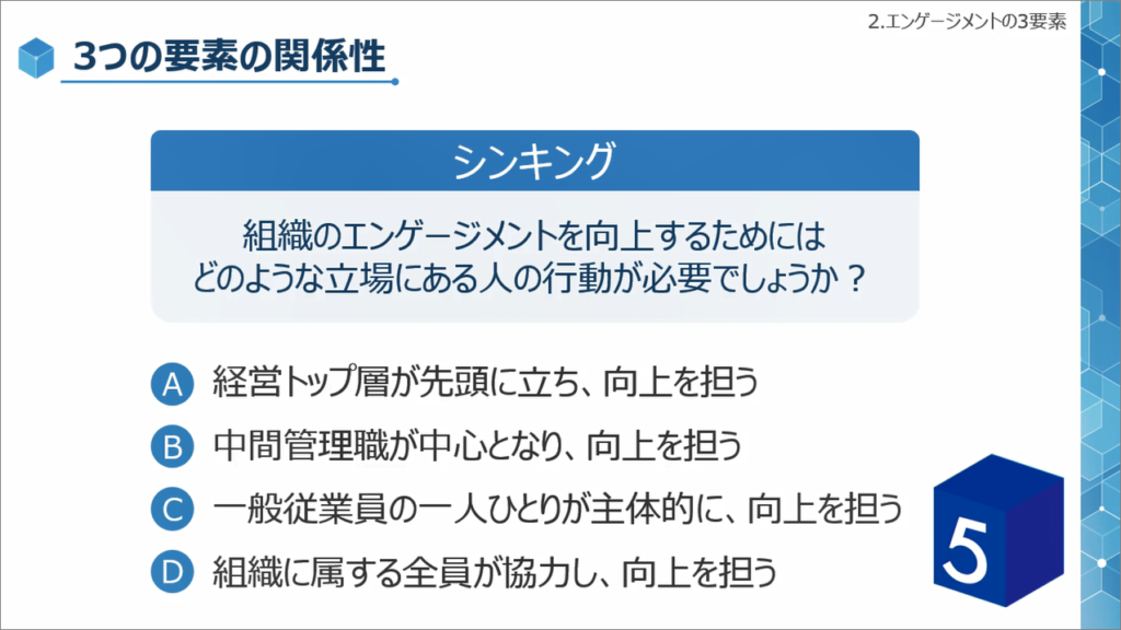 理解しやすいように、実際の事例を紹介しながらエンゲージメントの概念を分かりやすく解説します。また、自分の立場でエンゲージメントについて考える「シンキング」を通して、さらに理解を深めることができます。