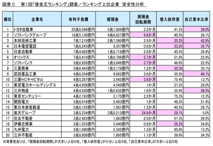無計画な借金は倒産リスクの上昇につながることから、綿密な事業計画のもとで、計画的な資金調達を行うことが重要です。その観点では、本ランキング上位企業は、借入金額は多いものの、安全性の低い企業はほとんど見られず、調達した資金を活用してキャッシュの創出につなげている点で、借金を上手に運用している企業といえます。