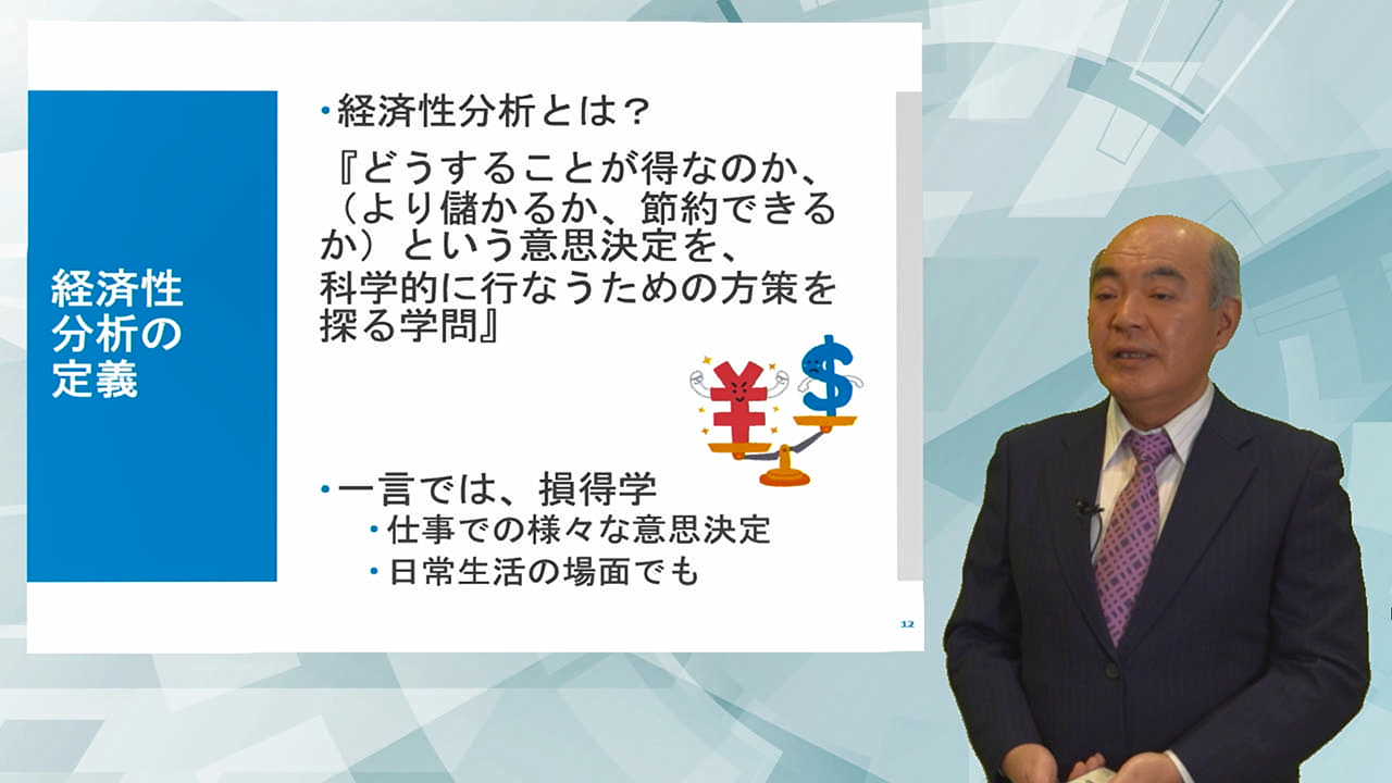 【概要】得する意思決定とは?金銭的な損得に基づく意思決定の基本を、経済性分析・経済性工学として学問的に体系化して解説します。前編では、例題を通して金銭的な損得を判断する基本の考え方について学び、後編では、有利な案の選択方法や意思決定の先送りが必要な場面での対応法などを学びます。