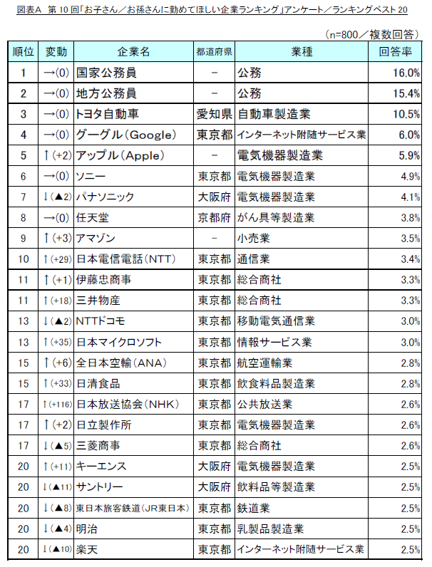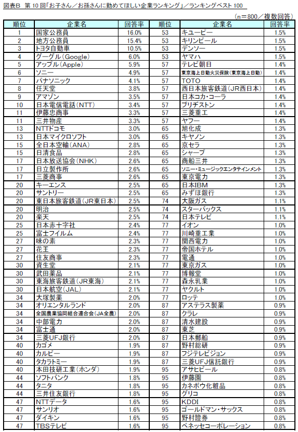 お子さんに勤めてほしい企業としては、1位「国家公務員」(回答率13.8%)、2位「地方公務員」(同10.9%)、3位「トヨタ自動車」(同5.1%)、4位「グーグル(Google)」(同4.0%)、5位「アップル(Apple)」(同3.3%)の順となりました。