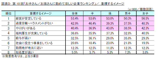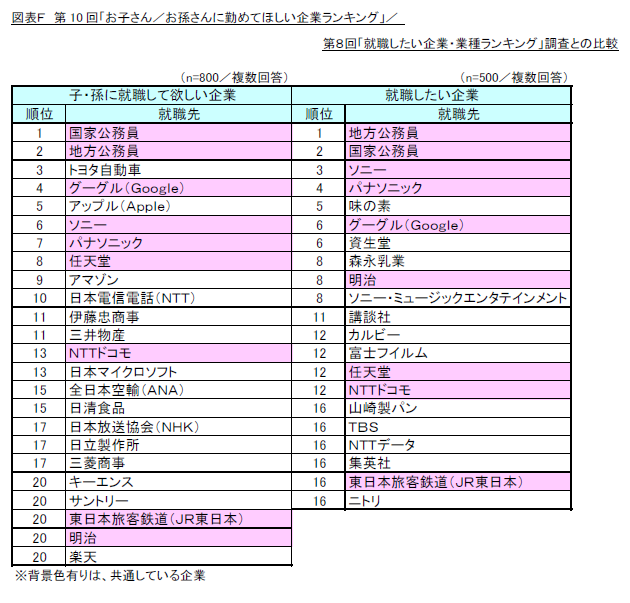 ・調査名称 :第10回「お子さん/お孫さんに勤めてほしい企業」調査