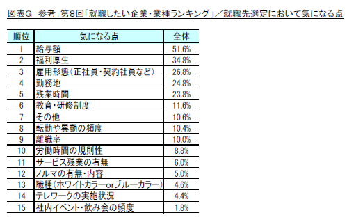 さらに、就活生ランキングにおいて「労働時間」や「業務ノルマ」への意識が高くないのに対して、本ランキングでは父母・祖父母が就職先選定に重視するポイントとして「過重労働・ハラスメントがない」が高順位となっている点については、お子さん/お孫さんには、「過度なストレスがなく、健全な環境で就労してほしい」という父母・祖父母の願いが表れている結果と言えます。(図表G)