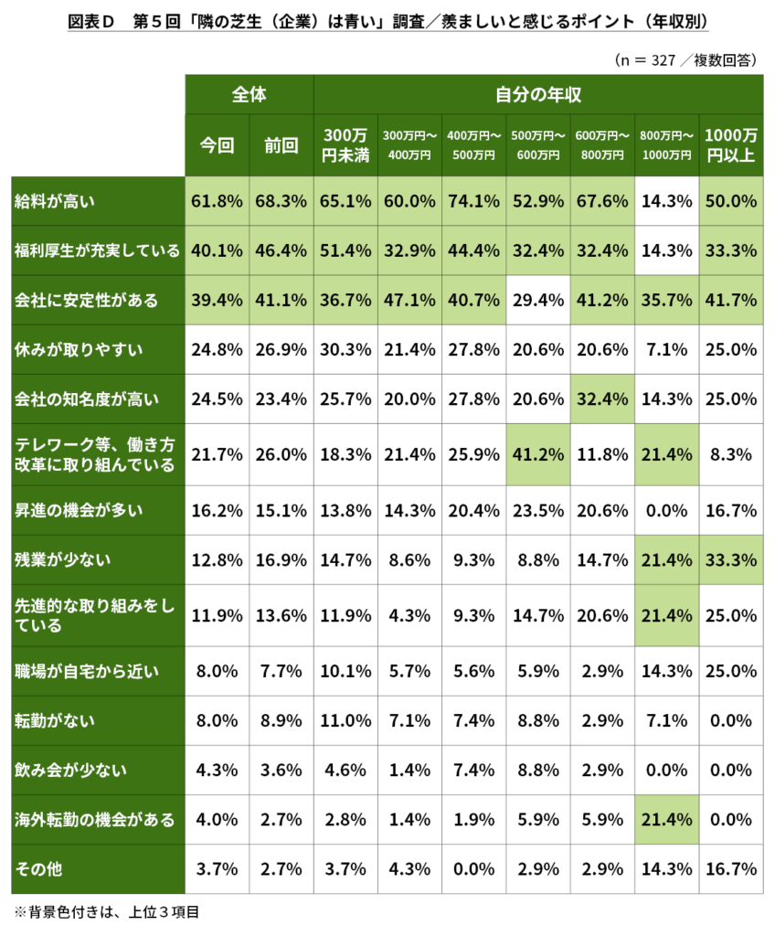 さらに、羨ましいと感じるポイントを年収別に集計したところ、年収800万円未満の層においては、「給料が高い」が半数を超える回答率を得て1位となっているのに対して、「年収800万円以上」では「残業が少ない」の回答率が高く、年収の多寡による羨望ポイントの相違もうかがえました。(図表D)