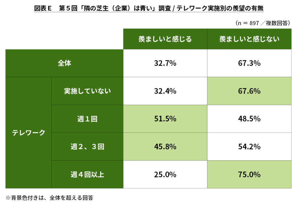 テレワーク実施別に「知人や友人の勤め先に対する羨望の有無」を調査したところ、「羨ましくない」と回答した割合は、「週4回以上」(回答率75.0%)及び「実施していない」(同67.3%)で6割以上を占めました。「週4回以上」では4人に3人が羨ましくないと回答しており、テレワーク頻度の高い働き方に満足している様子がうかがえ、「実施していない」層においては、業務柄テレワークができない勤務者が、テレワークの必要性を感じていない背景があると考えられます。一方、週3回未満の層では、約半数が「羨ましい」と感じる結果となっています。(図表E)